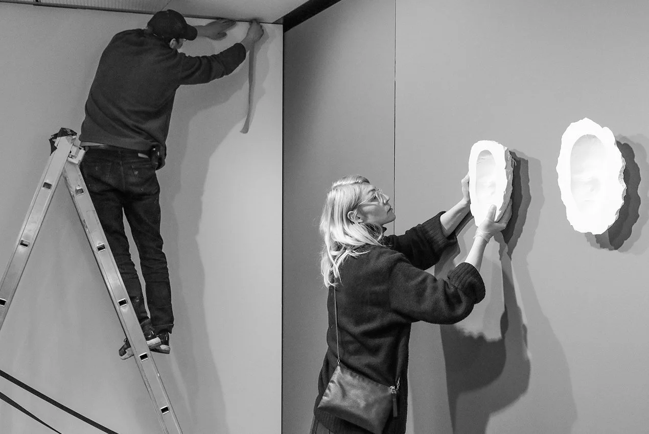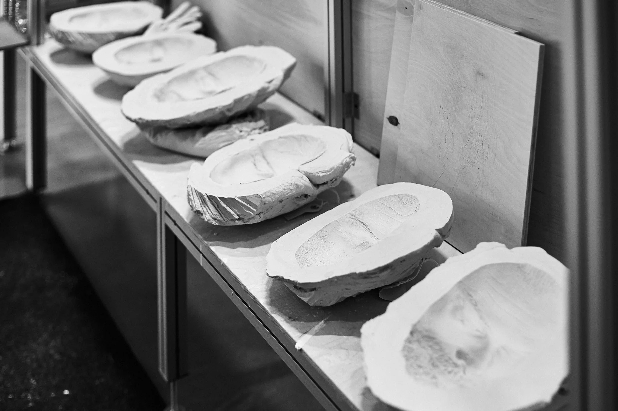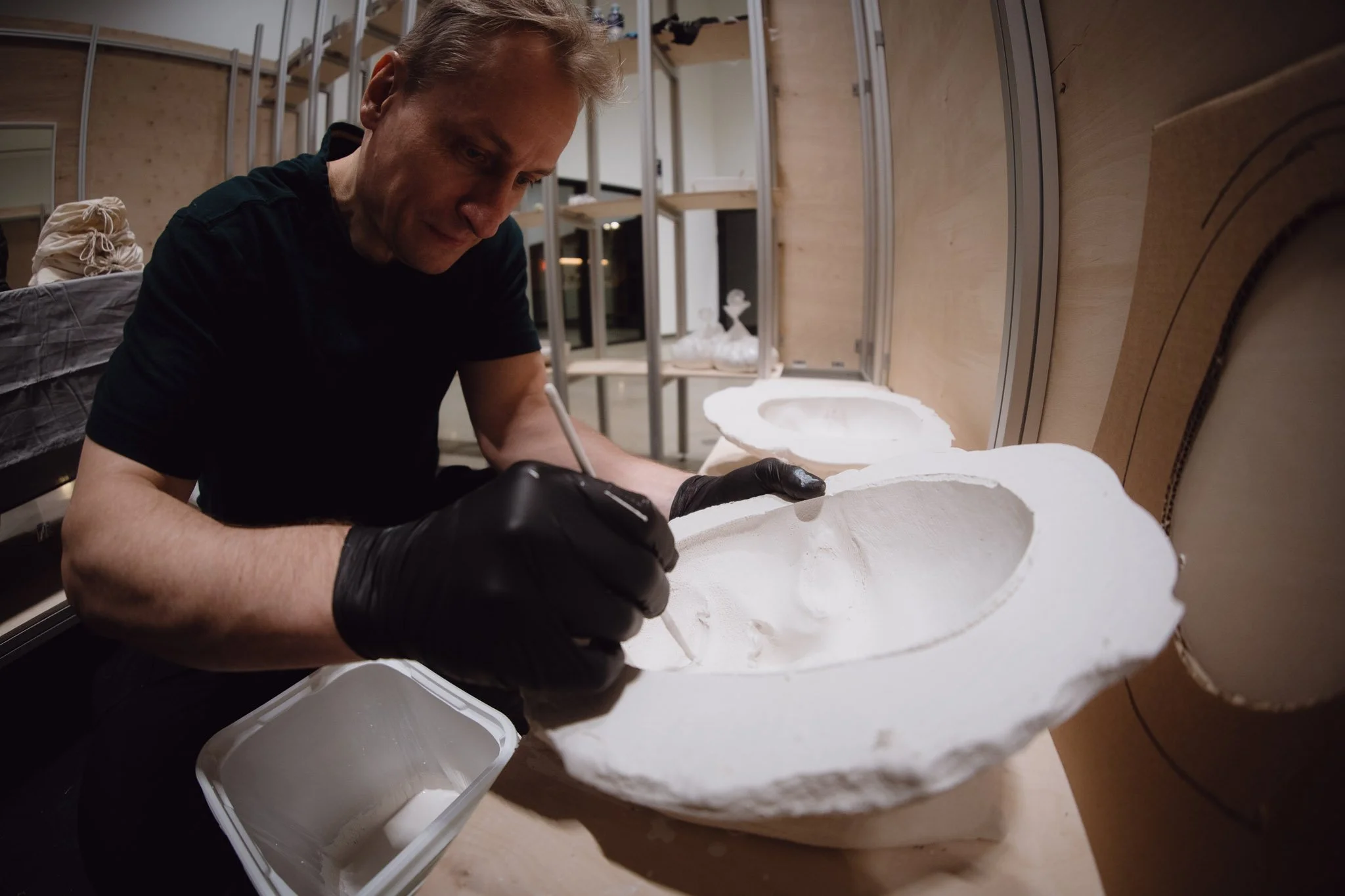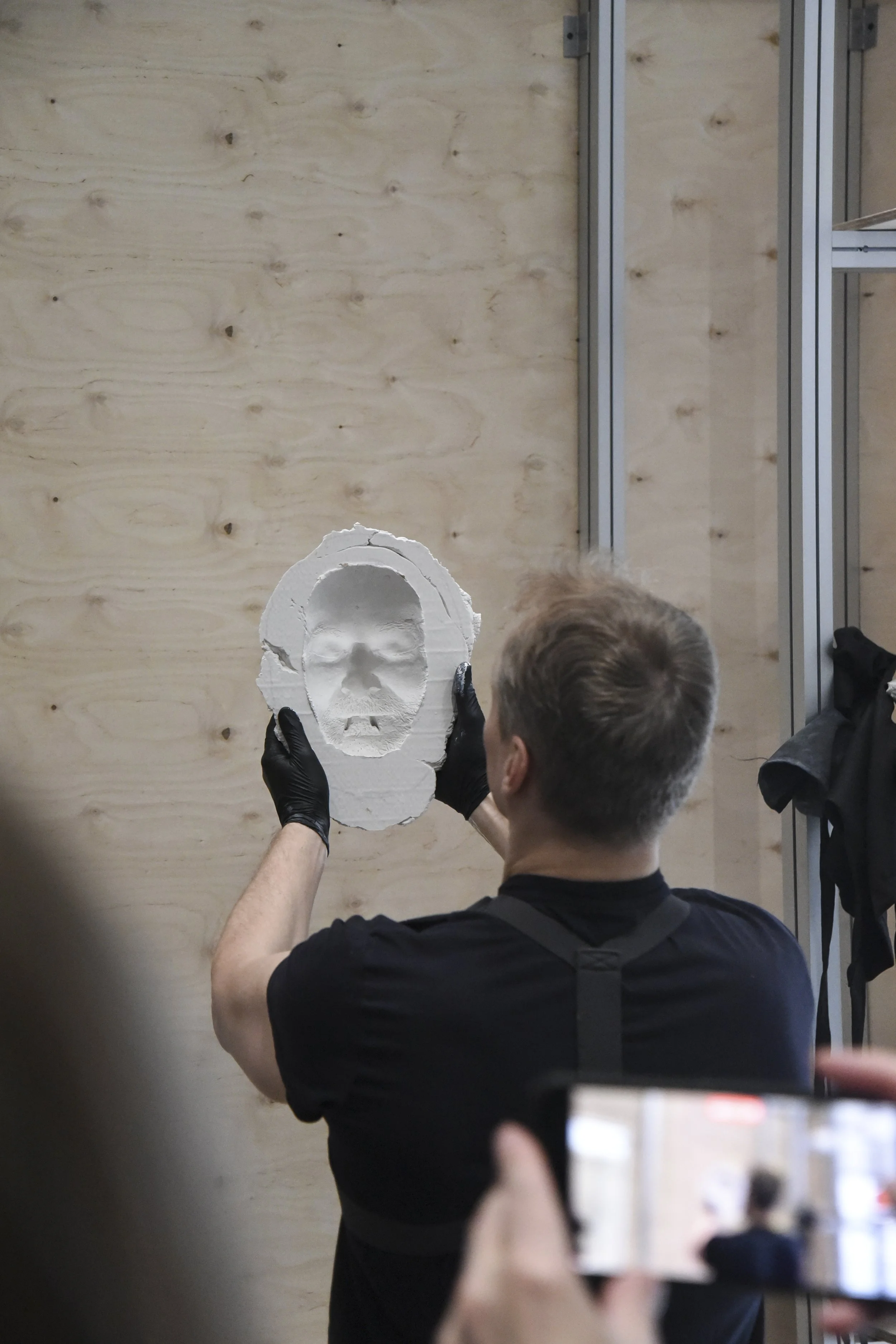 The first step was to create a functional and monumental space for a plaster mask-making workshop. The mask making process requires particular concentration of the artist, therefore, the space had to be relatively private, yet open for spectators who had a chance of observing the creative work.