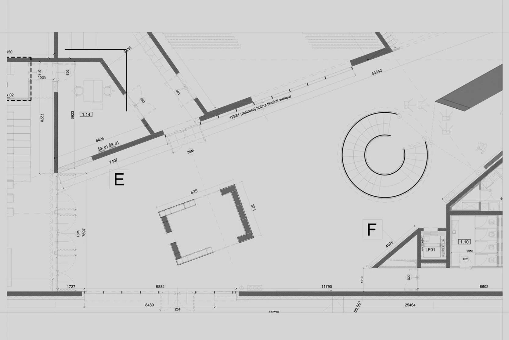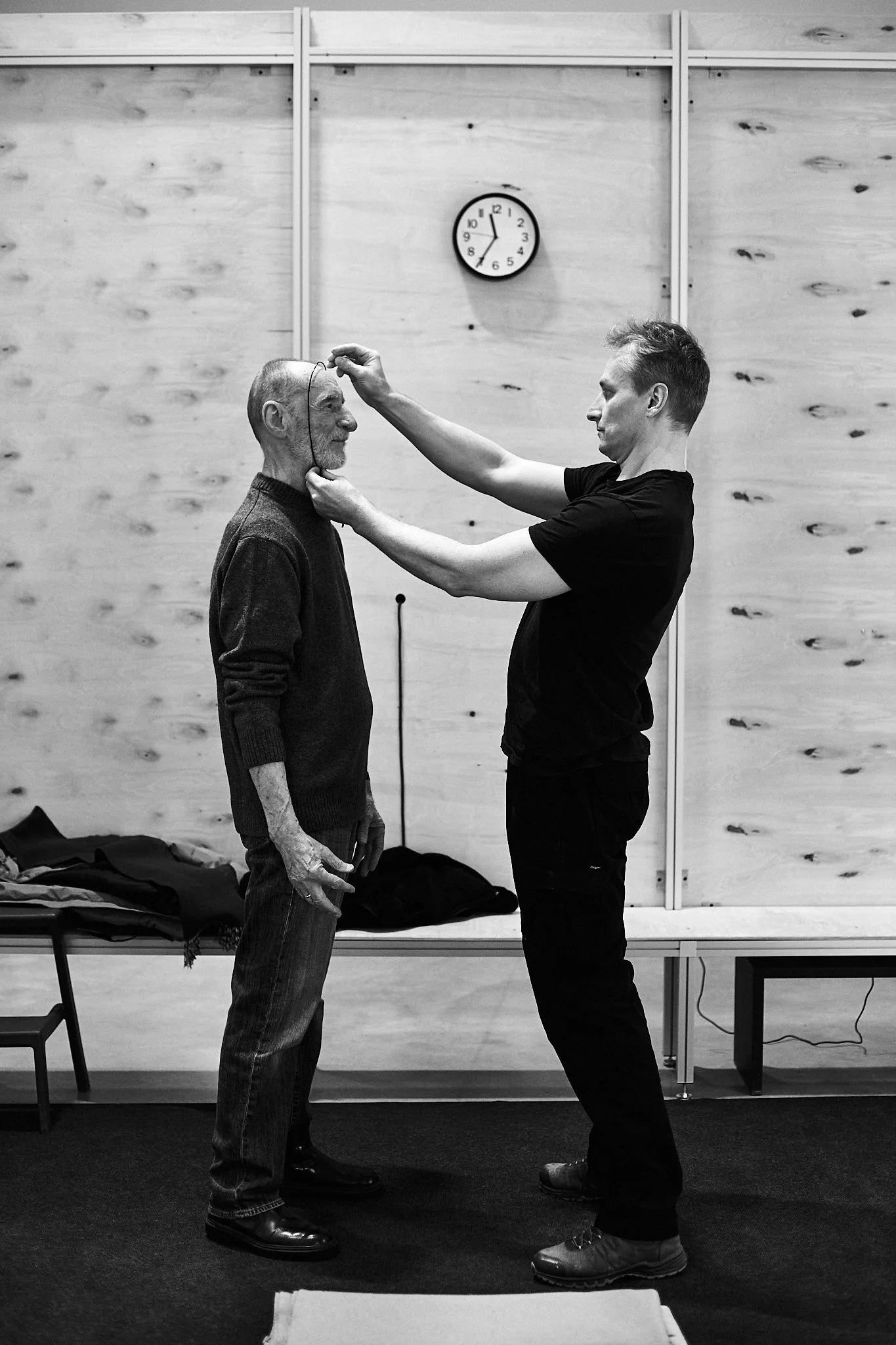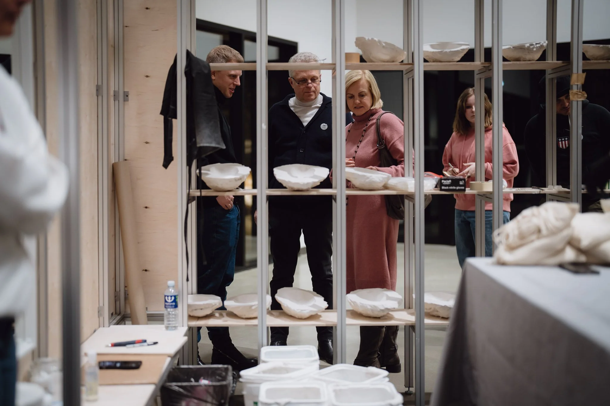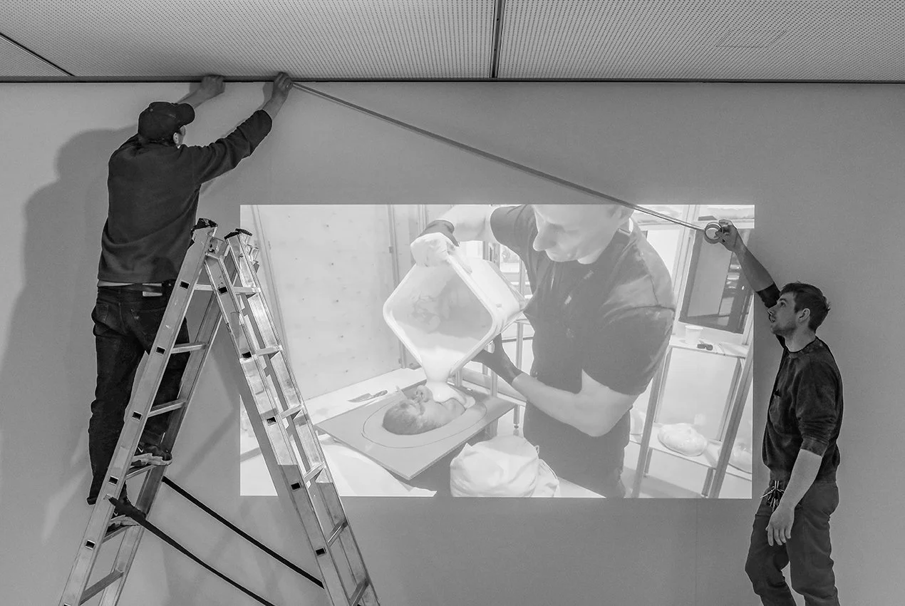 The first step was to create a functional and monumental space for a plaster mask-making workshop. The mask making process requires particular concentration of the artist, therefore, the space had to be relatively private, yet open for spectators who had a chance of observing the creative work.
