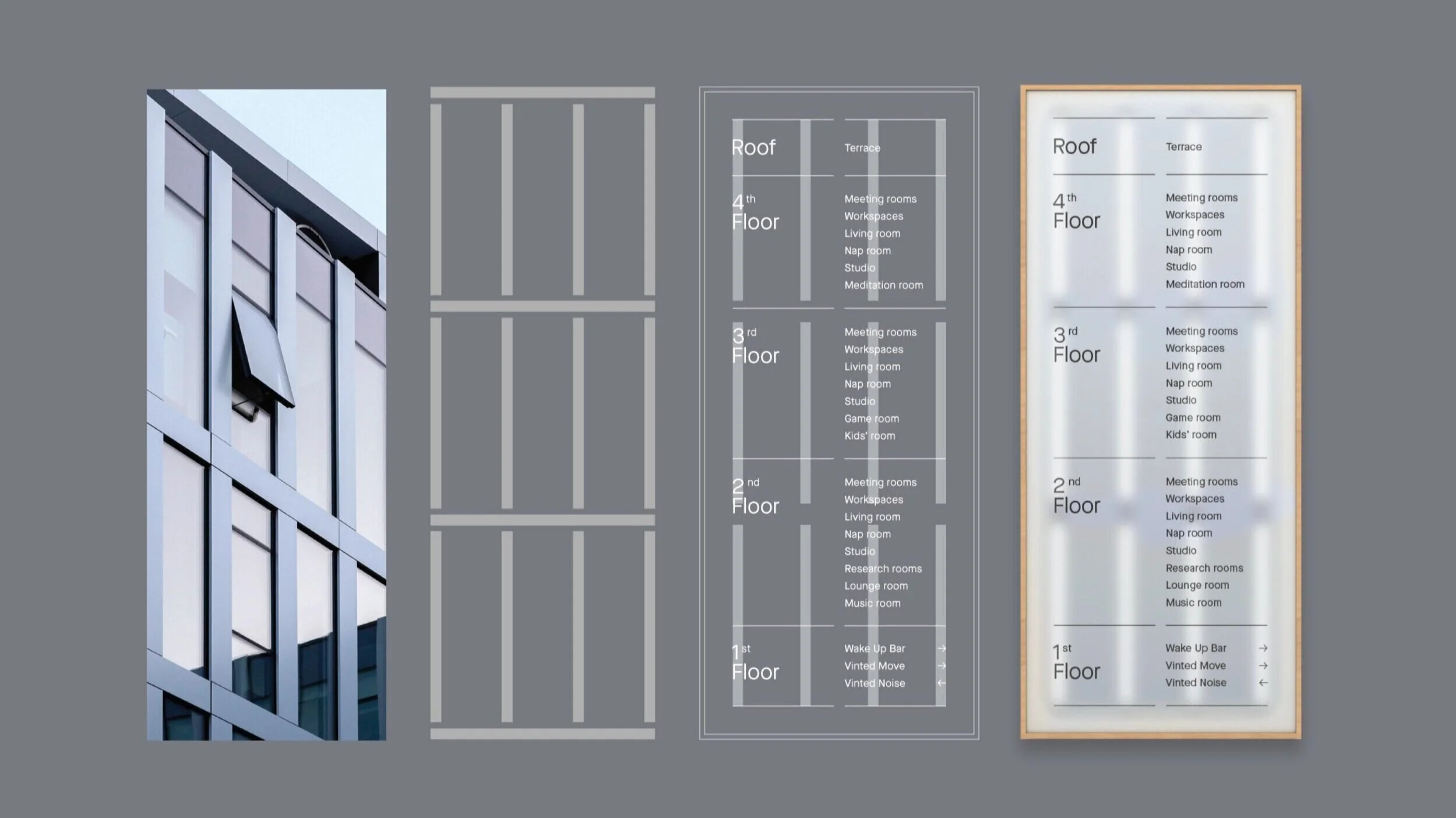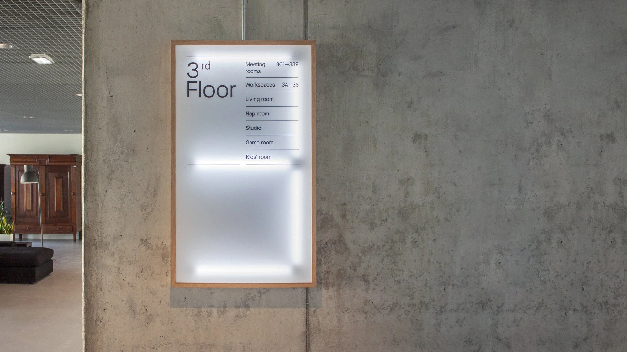 Our task was to create the way finding system that is both effective and neat. The main task was to help people quickly find and easily navigate among 4 floors and open space working areas. There was no doubt that the whole system and design language had to be simple and blend in the interior design – clear, straightforward, intuitive and easy-to-understand. Therefore, the solution has been based on function.